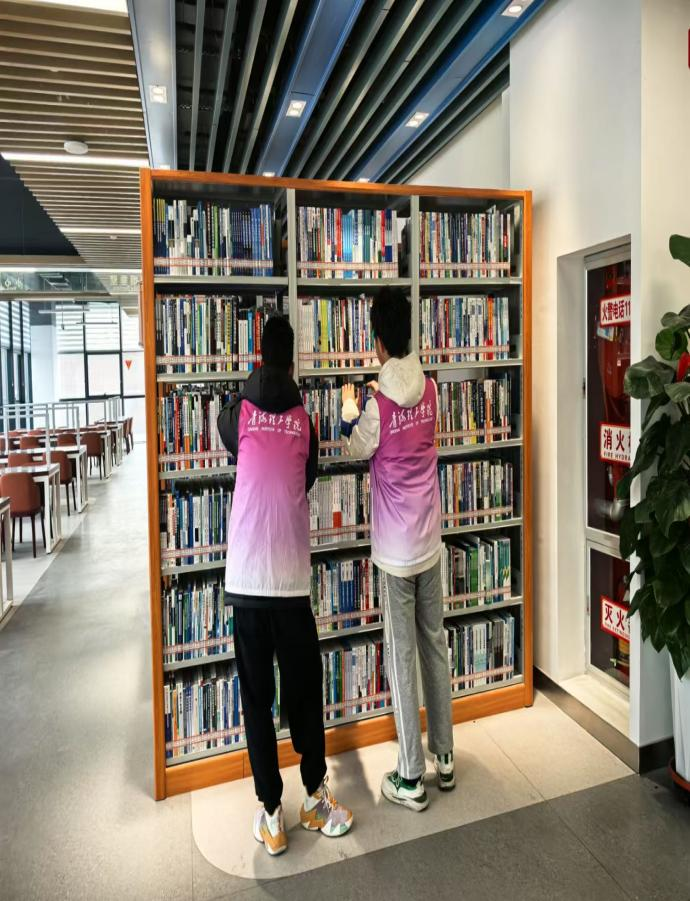 活动当日,志愿者们分为清洁组、整理组、机动组三组,分工协作全面清洁图书馆卫生、整理图书。清洁组细致擦拭书架、消毒公共桌椅、清扫地面及卫生死角,确保卫生整洁;整理组按索书号将社科类与自然科学类书籍归位,修补破损书页,并为新书粘贴分类标签;机动组协助搬运书籍、引导读者保持安静,并处理突发情况。